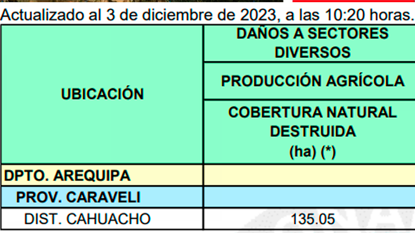 Al respecto, para el coordinador del Centro de Operaciones de Emergencia Nacional (COEN), Ricardo Pajares, la cicatriz de tierras afectadas solo es de 135.5 hectáreas, según infome del (Serfor). Mientras el COER Arequipa continúa en coordinaciones para usar helicóptero Bambi Bucket.