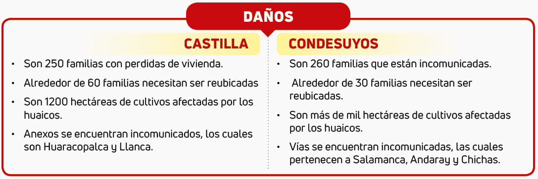 Alrededor de 500 familias que han perdido todo por los huaicos ocurridos en las provincias de Castillas y Condesuyos no pueden movilizarse debido a que las vías afectadas no están despejadas. Pese a que han bajado la intensidad de las lluvias en las zonas altas de Arequipa, el Gobierno Regional de Arequipa (GRA) no envía suficiente maquinaria a los anexos damnificados.
