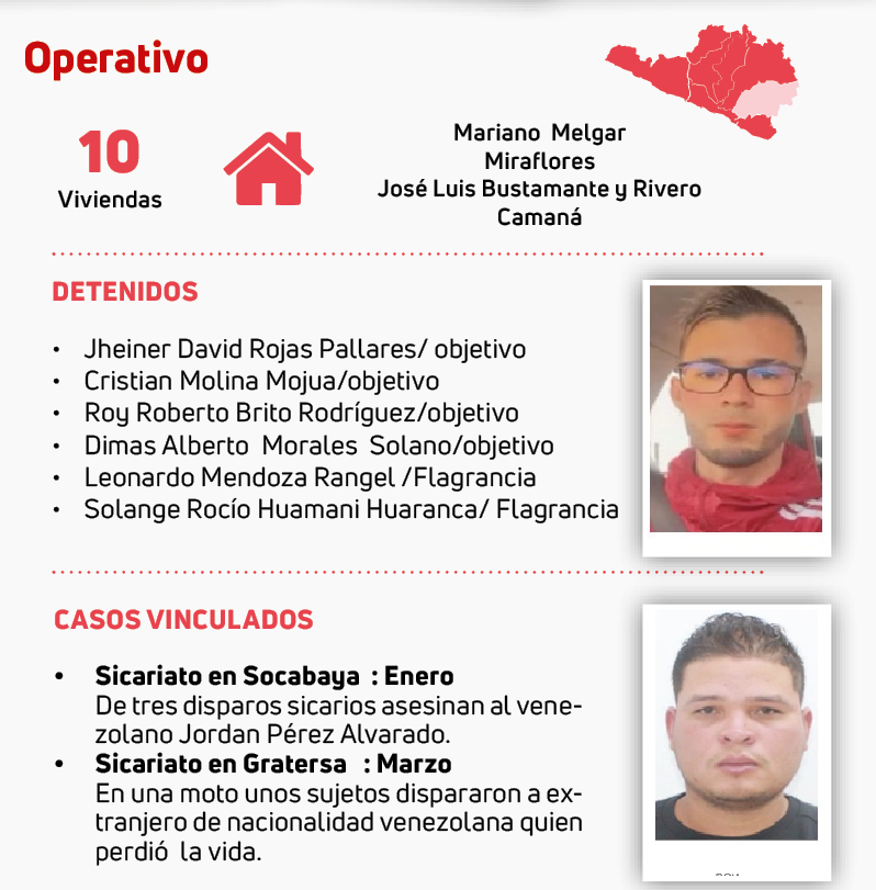 La Policía intervino desde las 20 horas del 24 de junio hasta las 6 horas del 25 de junio del 2024, viviendas y detuvo a cuatro personas. El jefe de la IX Macro Región Policial, general Colin Sim Galván, reveló que se dispuso la detención preliminar de cinco personas y el allanamiento de 10 inmuebles en la región Arequipa. La Policía detuvo a cuatro de los objetivos y dos sujetos más en flagrancia por el delito de tráfico ilícito de droga. Incautaron S/71 260, un arma de fuego, 20 equipos celulares, 9 tarjetas de distintos bancos, 1 bolsa con tarjetas de presentaciones de préstamo informal, entre otros.