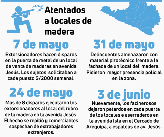 Continúan extorsionando a negociantes del rubro de las maderas. El último caso ocurrió a las 18 horas del lunes 3 de junio, cuando sujetos lanzaron un petardo a dos aserraderos en la avenida Isla en Cercado de Arequipa. (Ver foto)